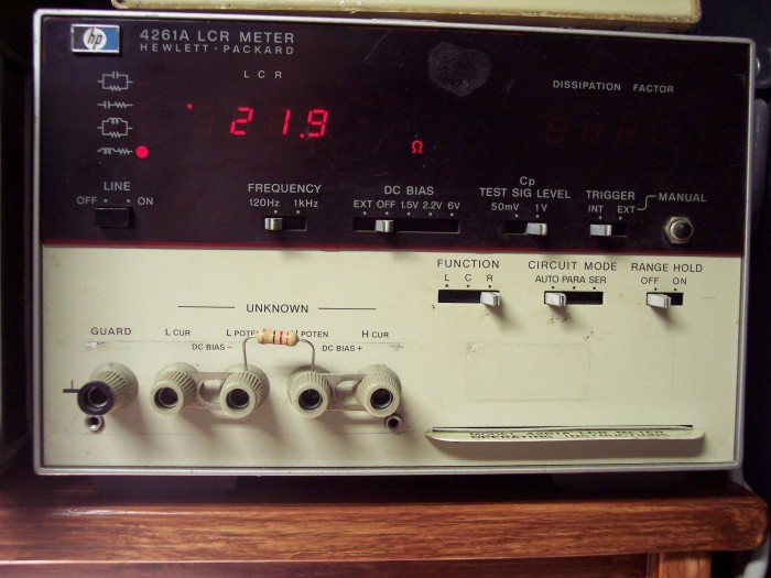 The picture shows a 22 ohm resistor connected directly to the measurement terminals of the meter. The display is showing 21.9 ohms. I suspect that this is a self balancing analog bridge with digital readouts. Note that the frequency is set to 120 Hz to be sure the measurement is as close as possible to the true DC resistance.