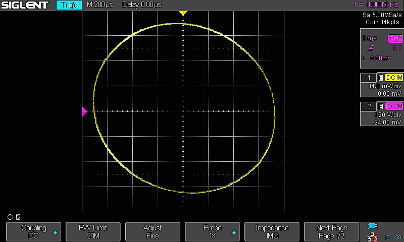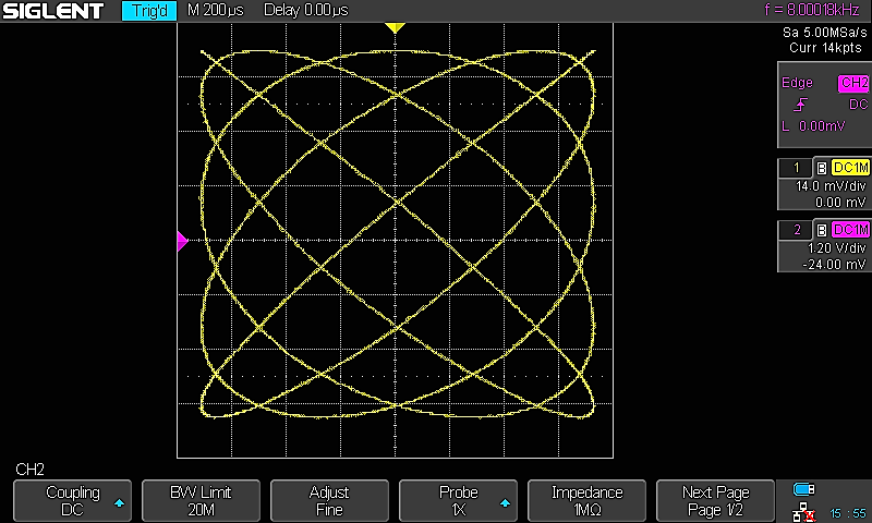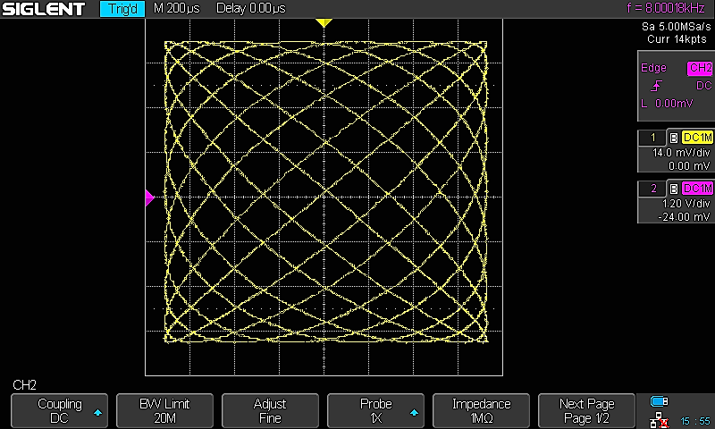 As you can see on the acquire menu this scope has an X Y mode. It behaves much better than on other DSOs I have used. When I set up two function generators with a frequency difference of 0.2 Hz and view one on each channel, the two sine waves drift smoothly across each other at a rate of one cycle every 5 seconds. When I invoke XY mode the familiar progression of positive sloping line - ellipse - circle - ellipse - negative sloping line goes in small jumps. However the pattern is very clean as you can see below. I don't know what they are doing but whatever it is, it works.