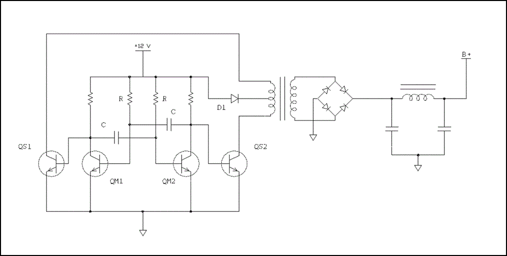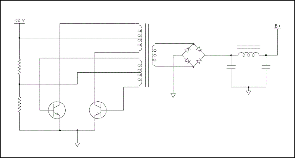 Even in the 1950s, transistor supplies were available in Amateur Radio handbooks for mobile stations. These consisted of a specialized transformer in a Royer oscillator configuration, with a feedback winding to drive the transistor bases. An advantage of this supply was that an overload on the output would cease oscillations and prevent the transistors from destroying themselves.