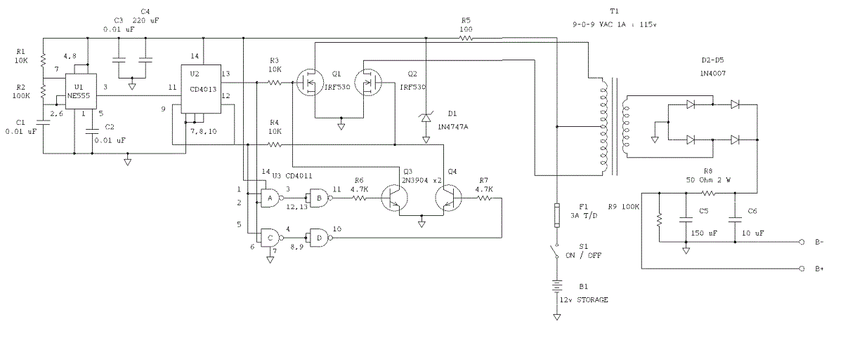 Another component of note is D1. It should be rated at the necessary current for full power output through T1. This prevents high voltage spikes generated by the transformer from reaching the 12v rail and damaging the oscillator transistors. This can happen and a designer could spend days chasing tail trying to find out why. A normal power rectifier diode is suitable but a Schottky diode would dissipate less power and run cooler.