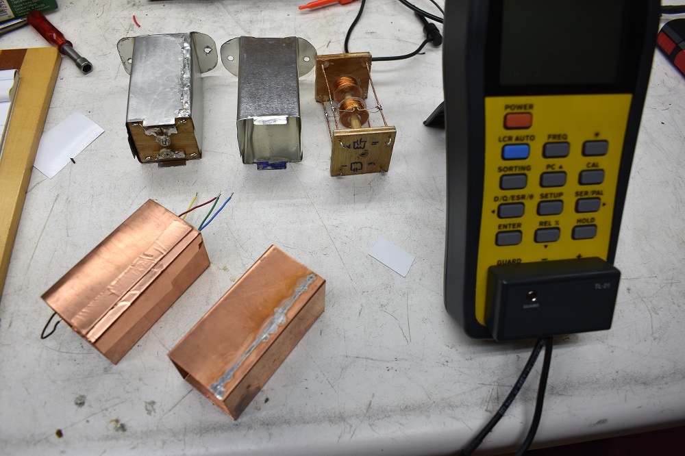 CapacitorQ Meter Plate 455 100 1.54 No Q Meter Grid 455 90 1.52 No DCLR Meter Plate 100 25.6 1.5511 Yes DCLR Meter Grid 100 19.57 1.4087 Yes Next I wanted to measure the inductance and Q of the coils inside the shield can. But Bill had presented me with a problem in this area. He sent me one transformer and two shield cans. One was soldered along the seam while the other was not soldered as shown in the photo below. When I took this picture I had already placed copper foil tape along the seam.