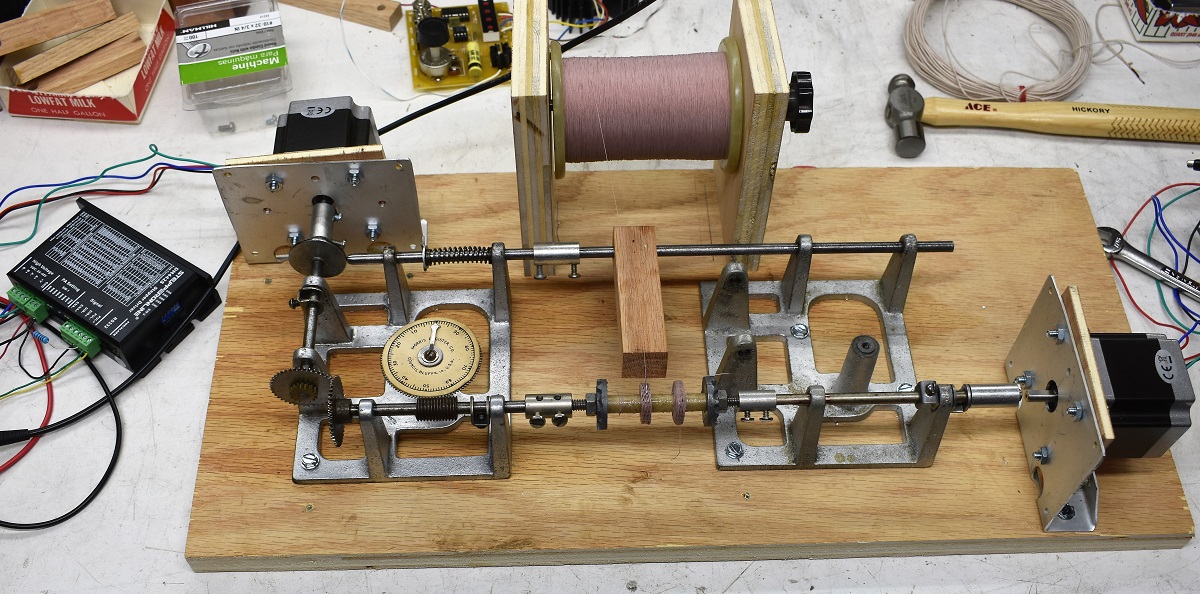 Some may call me lazy for motorizing the coil winder but I think it is a valid modification that others who already possess a winder may want to duplicate. With the motor providing the power I have both hands free to apply drag to the wire if necessary and watch the progress to be sure all is going well. That's a far cry from turning the crank with one hand, holding the winder from sliding around on the bench with the other and applying drag on the wire with the other. Wait a minute. Did I just run out of hands? Aside from that I used a stepper motor and bought the controller instead of trying to build it myself. That means that the motor can be run at a fraction of its maximum speed and still run as smoothly as a geared down motor. I have been running it at 1 revolution per second. Which means it takes 5 minutes to wind a 300 turn coil.