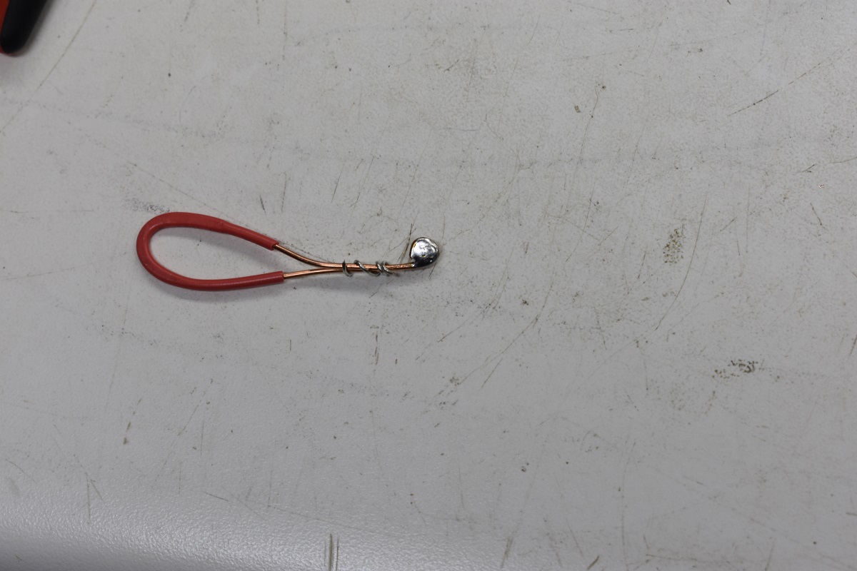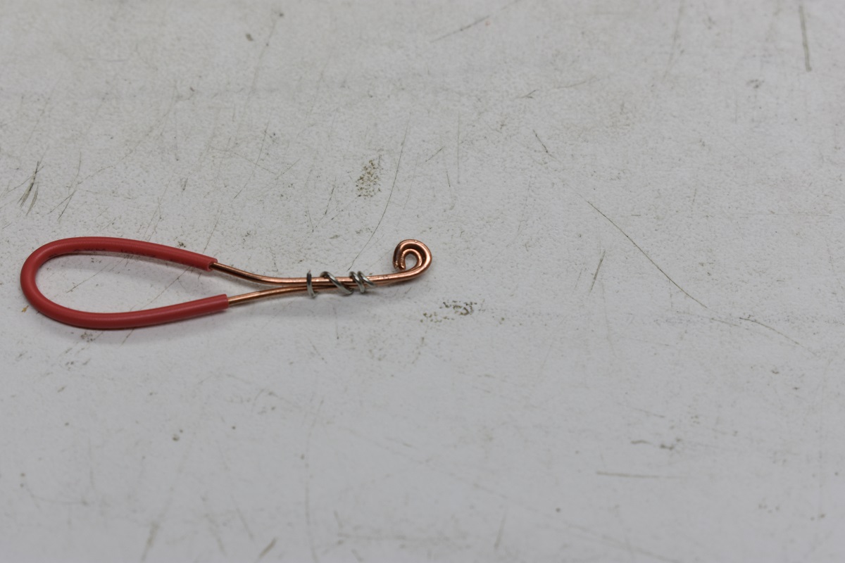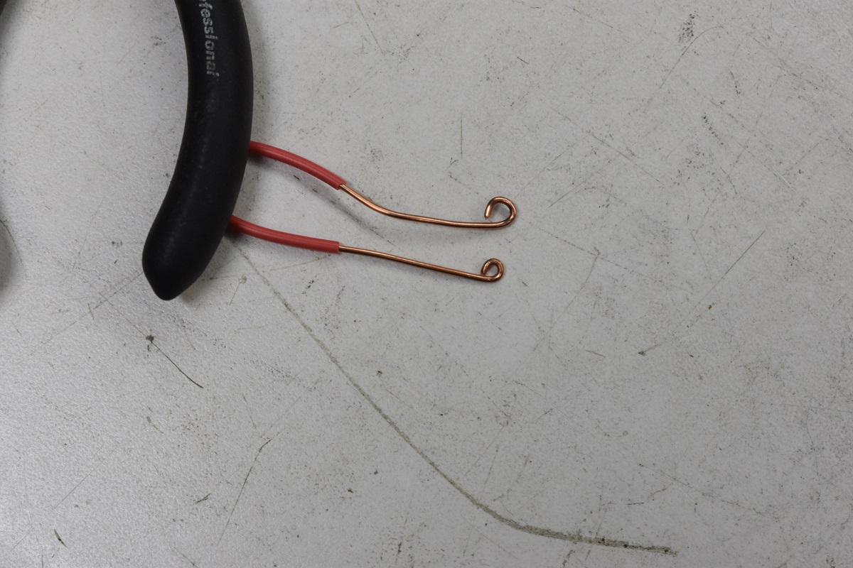 Cut an approximate 4 inch length of number 18 solid wire and remove most or all of the insulation. At one end bend a circle in the end of the wire. Use the tip ends of your smallest pair of needle nose pliers. Now at the other end bend a slightly larger circle as shown in the picture below.
