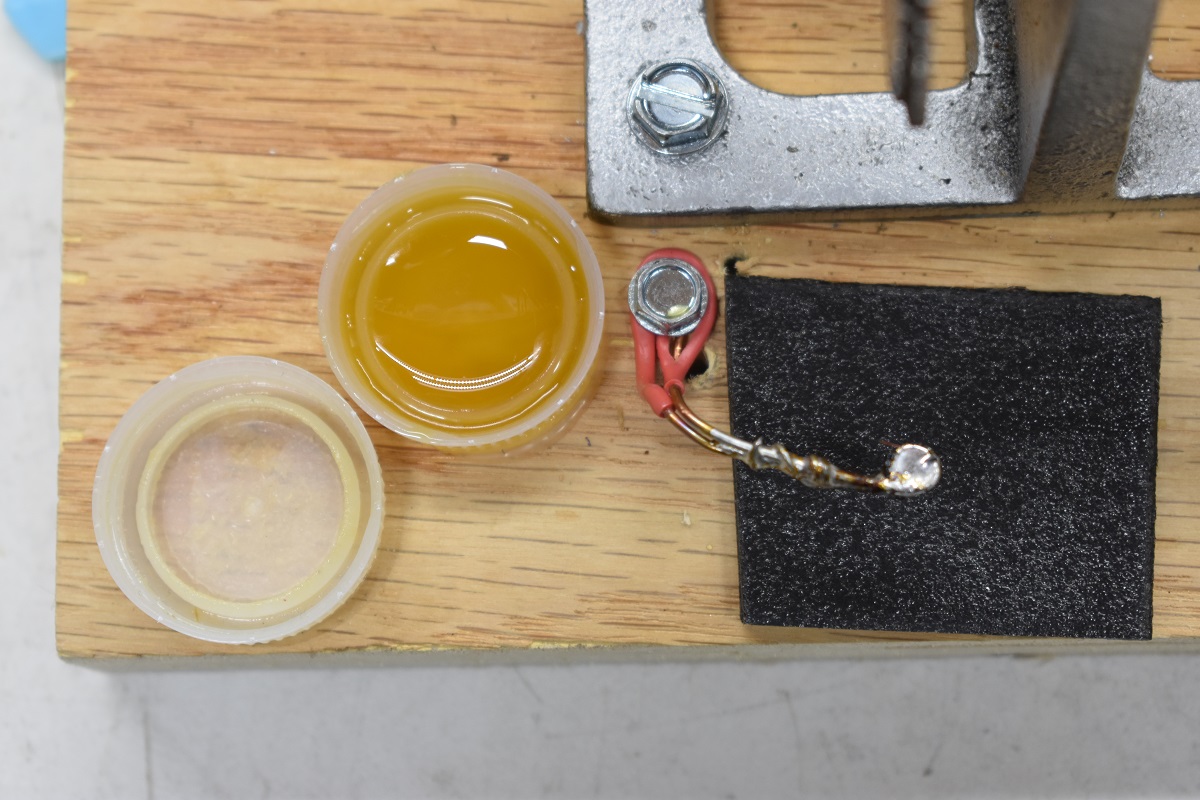 The other two objects are caps from Nestle's Pure Life water bottles. These are also glued to the wood. These hold a small amount of soldering flux so I could test two different kinds. This will be explained following the instructions for using the tinning tool.