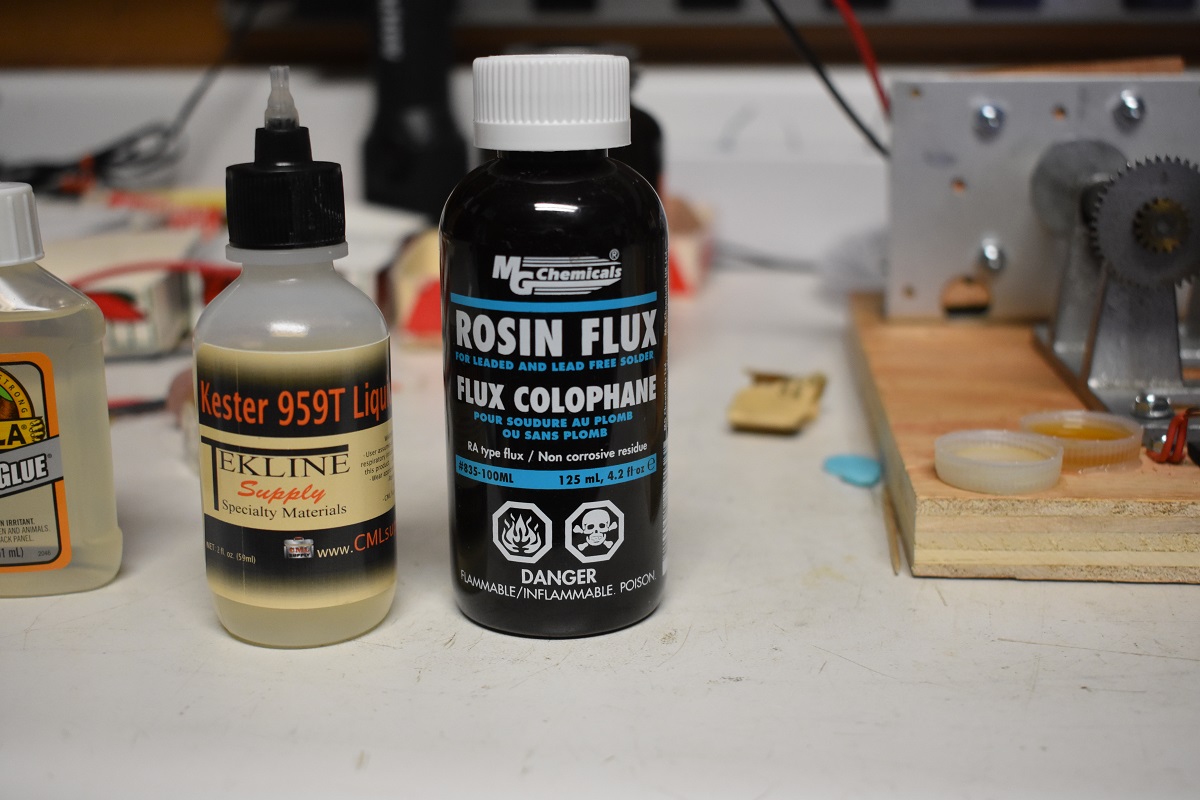 The one on the right is the traditional rosin flux. It has a stronger odor and doesn't evaporate nearly as fast. But it is the stickiest substance I have ever encountered this side of super glue. I got some on my hands and the sensation was close to the first time I used super glue and like many first time users glued my thumb and forefinger together. Not only that, when I went to wash my hands I found that soap and water wouldn't even scare it. I had to wash with some of the afore mentioned drug store alcohol. As you might have guessed spills are tough to clean up.