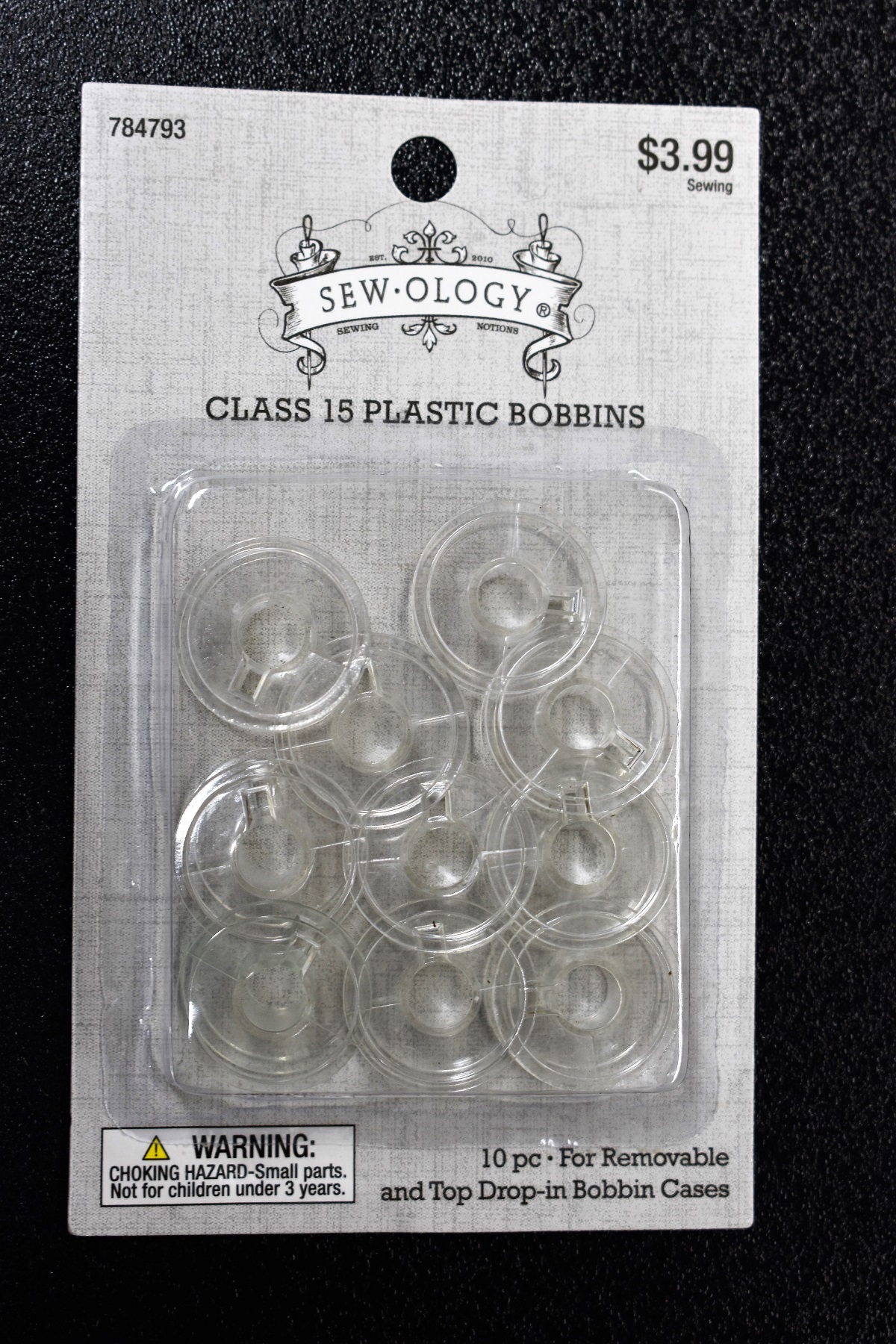 The procedure of winding two coils on a cardboard tube with the coil spacing determined by guess and by gosh, is not calculated to produce satisfactory IF transformers. After borrowing sewing needles from the ladies we are going to borrow bobbins. They are intended to hold thread in a sewing machine. While not the perfect size they will do as coil bobbins which will permit adjustment of coil spacing after the coils have been wound. Plastic bobbins come in a blister pack of 10 for $3.99 as shown below.