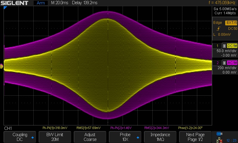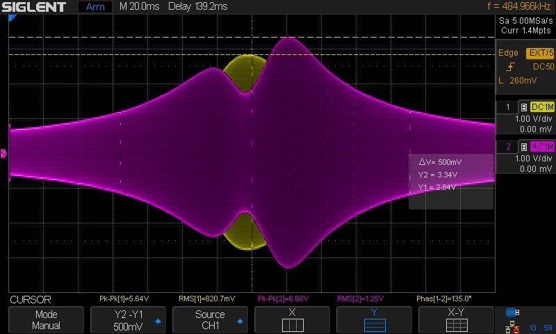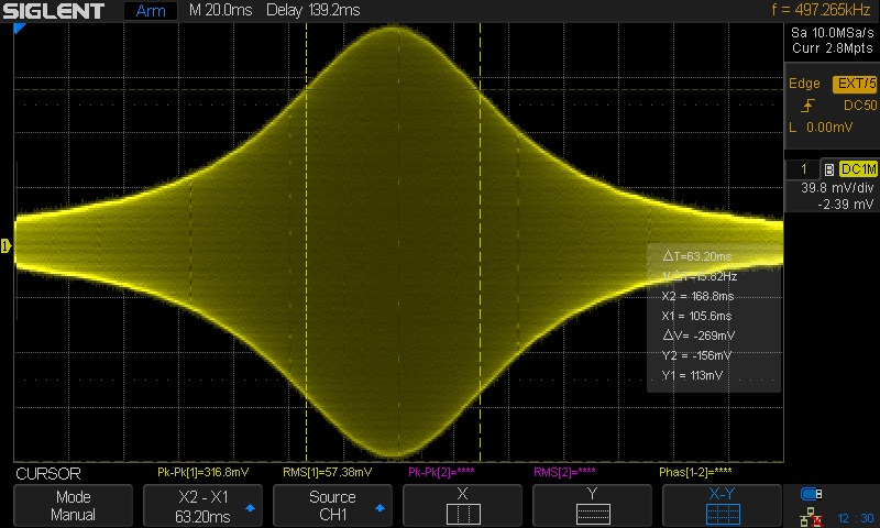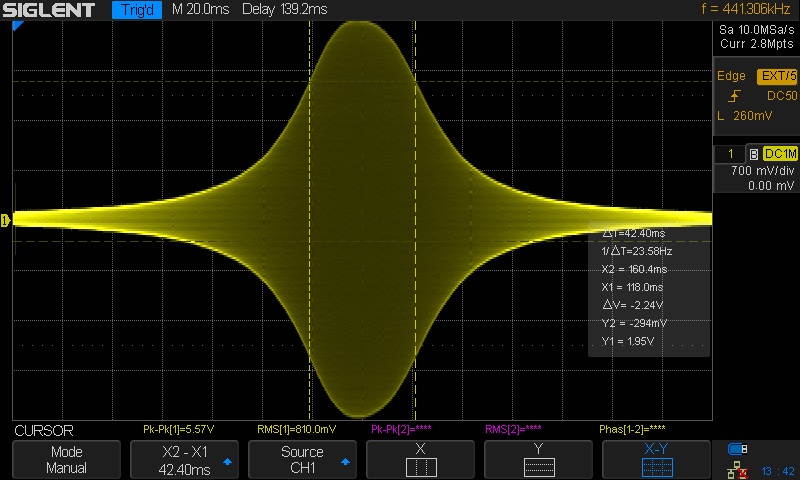 To understand the cursors you probably need a little help. The Y1 cursor is set to the -3 dB point on the curve. The vertical range is set to 700 mV / div. The curve comes up 4 div from the center so the height of the curve is 700 mV/div x 4 div = 2.8 v. -3 dB is 2.8/sqrt(2) = 1.98 V. The Y1 cursor is actually set to 1.95 v but what's 3 hundreds of a volt between friends? The X1 and X2 cursors are set to the -3 dB points on the curve. X1, X2, and ΔX are read out in milliseconds so we must translate them to kHz. The time per division is set to 20 ms/div and the frequency scale is 10 kHz/div. Dividing 10 kHz/div by 20 ms/div causes div to cancel leaving 0.5 kHz/ms. So the ΔX reading of 42.4 ms translates to 21.2 kHz. That's wide enough for high fi sound but too wide for night time D exing.