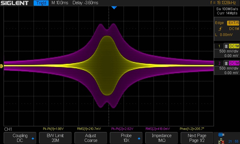 If you don't have a two channel scope just leave off the channel two connection. If you want to measure the insertion loss you will have to move the scope probe from the secondary to the primary. You will also have to readjust both trimmer capacitors because the probe adds some capacitance. Your goal in adjusting will be to achieve the double humped response as shown as shown by the purple trace in picture 3 below and have the center of the dip occur near the intended center frequency of the transformer. I acknowledge that this will be difficult without being able to see the secondary voltage. Thinking of using an RF voltmeter? Do it ONLY if you can rig up a scope probe to work with it. Also remember to stop the sweep and set the generator to a constant frequency.