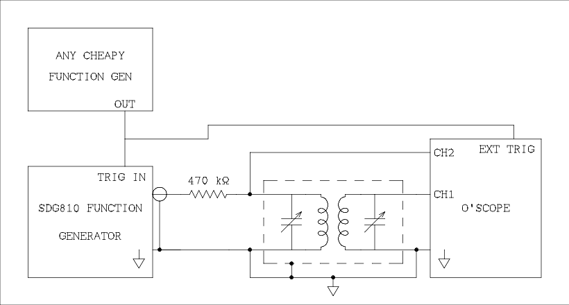 If you have a single channel generator that has a trigger input, not a trigger output, you need another function generator. I have seen bare board generators for 10 dollars. Or you could go with the 50 dollar Chinese generator I discuss on my daily log page. Here is how to hook it up.