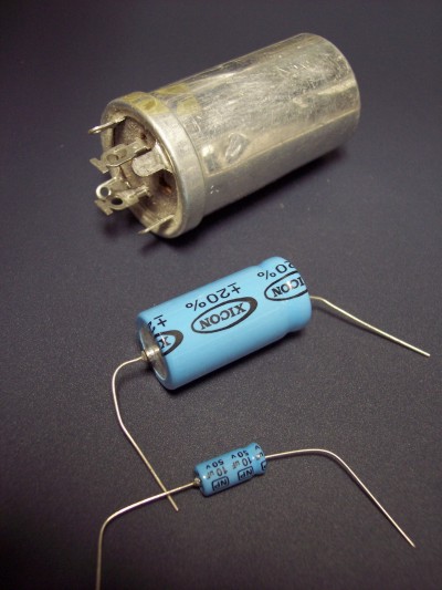 Electrolytic capacitors are unique enough to warrant a section of their own. In the picture above top is a two section can electrolytic. The negative end of both capacitors is connected to the can and the positive ends are brought out to the two large lugs. A capacitor of this type mounts in a special cutout made in the chassis in a factory or more often mounts on a mounting plate which has slots for the four smaller lugs that are around the edge of the bottom of the can. These capacitors are made with up to 4 separate capacitors in one unit.Next is a single 450 volt capacitor that is used in tube circuits. Below that is a small 25 volt capacitor that is found in transistor circuits.