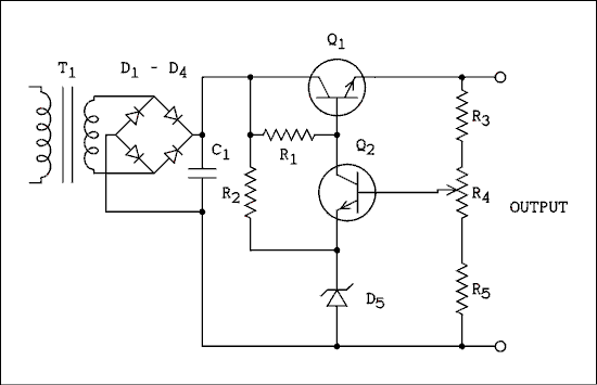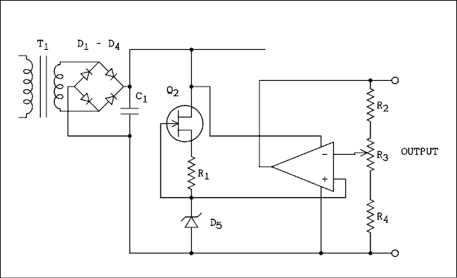 You may not have realized it but the pass transistor in a regulated power supply is an emitter follower. The circuit of a simple adjustable voltage power supply is shown in figure 6.14. The diagram has been arranged in such a way as to emphasize the fact that the pass transistor is an emitter- follower.