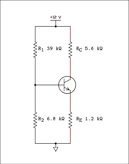 Note: If you follow the links below, use your back button to return here.First, we will calculate the Thevenin equivalent of R1 and R2 in the base circuit from Equations 4.18 and 4.19. VBB = 12 v x 6.8 k ohms / (6.8 k ohms + 39 k ohms) = 1.78 volts. RB = 6.8 k ohms x 39 k ohms / (6.8 k ohms + 39 k ohms) = 5.79 k ohms.If we don't know beta we can apply Equation 4.24.