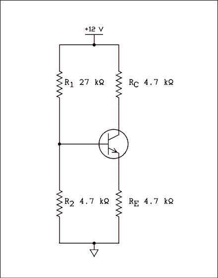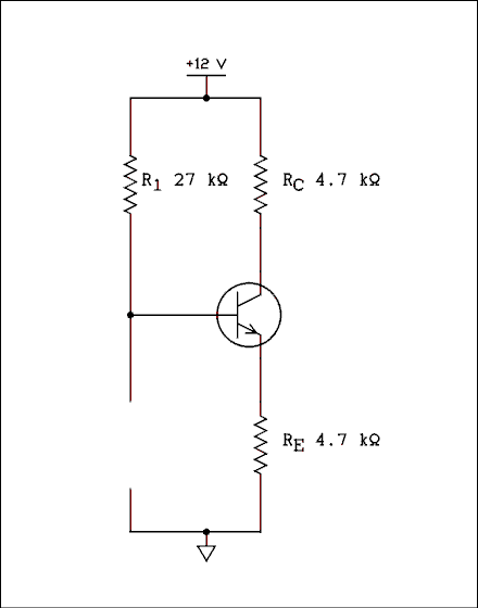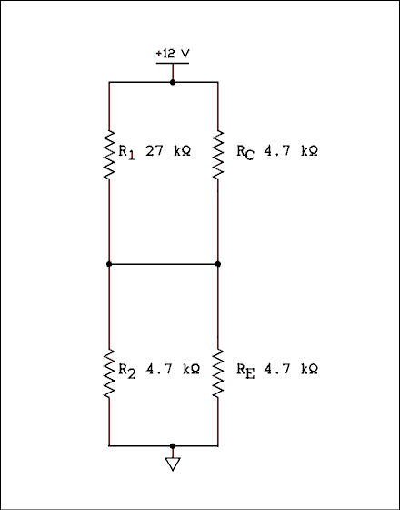 R1 in parallel with RC is (27 k ohms x 4.7 k ohms) / (27 k ohms + 4.7 k ohms) = 4.0 k ohms. R2 in parallel with RE is (4.7 k ohms x 4.7 k ohms) / (4.7 k ohms + 4.7 k ohms) = 2.35 k ohms. Applying the voltage divider equation gives VEBC = 12 v x 2.35 k ohms / (2.35 k ohms + 4.0 k ohms) = 4.44 volts. This seems rather far away from the measured value of 6 volts.If R2 opened the circuit would become that of figure 6.5.