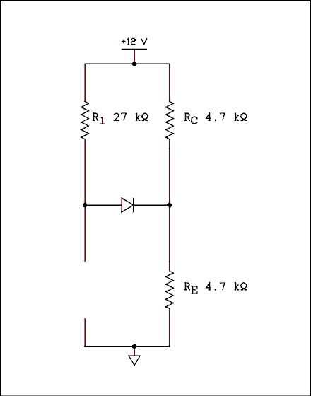 If we neglect the drop across the diode in figure 6.6, we have a voltage divider consisting of R1 in parallel with RC and the parallel combination is in series with RE. The voltage at all elements is VEBC = 12 v x 4.7 k ohms / (4.7 k ohms + 4.0 k ohms) = 6.48 volts.The possibility that the transistor is shorted gives a voltage of 4.44 volts and the possibility that R2 is open gives 6.48 volts. The original measurement was approximately 6 volts. 6.48 is closer to 6 than 4.44 v; therefore, the answer must be that R2 is open. If the transistor is good, the voltage at the base would be 0.6 or 0.7 volts higher than that at the emitter. Since our cheap voltmeter did not show us this difference between 6 and 6.6 volts, it could not show us the difference between 6 and 6.48 volts.