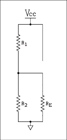 With all voltages being the same, our first conclusion might be that the transistor is totally shorted. If the transistor were shorted (everything to everything) the circuit of figure 6.4 would result. This fault places R1 in parallel with RC and R2 in parallel with RE. The two parallel combinations form a voltage divider across the power supply.