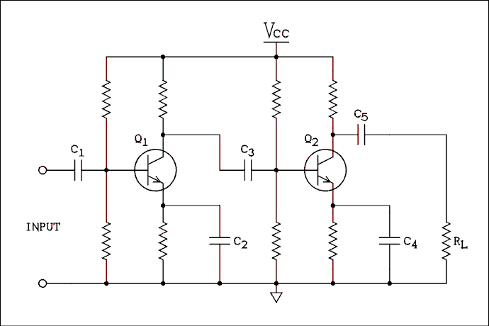 AC coupled amplifiers make up a significant percentage of amplifier circuits. They are used in audio, radio frequency and industrial applications.An AC coupled amplifier is shown in figure 6.17. The emitter resistors are bypassed to increase the gain to the maximum. Capacitor C1 prevents whatever may be connected to the input from upsetting the base bias of Q1. C3 prevents the DC voltage at the collector of Q1 from upsetting the base bias of Q2 and C5 prevents the DC voltage at the collector of Q2 from reaching whatever is connected to the output.