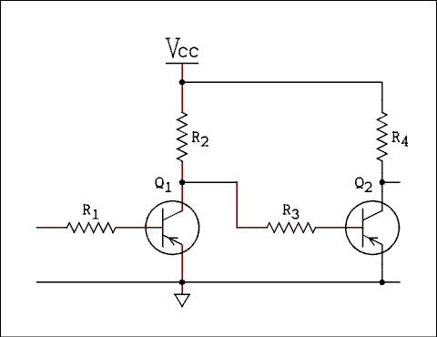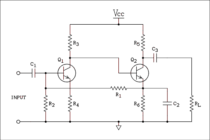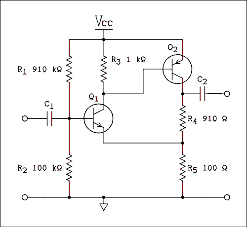 Figure 6.19 shows a configuration involving an NPN and a PNP transistor. This circuit is stabilized by DC feedback from the tap on the collector resistor of Q2 which feeds back a portion of the output voltage to the emitter of Q1. The voltage at the node between R4 and R5 will adjust itself until Q1 has just the right collector current to provide just the right amount of bias to Q2.