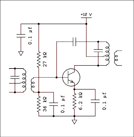 Figure 6.22 (b) is a circuit often seen in portable FM radios. Because these radios use a single polarity power supply the transistor must be biased with the usual three resistor circuit which means that the base must be grounded through a capacitor rather than directly. The coil is a low Q RF choke which is tuned to the center of the FM band by circuit capacitance. The impedance at the base of a ¼ wave antenna is low which is a match for the input impedance of the amplifier. DC measurements should turn up a fault but connecting a voltmeter lead or oscilloscope probe may well make the circuit start oscillating. It may be necessary to connect a short across the collector coil to kill this oscillation in order to obtain good measurements.