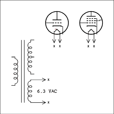 Another way to indicate heater connections is shown in Figure 8.1. The letter X is used to indicate that the power source is indeed connected to the tube heater even though it is not shown with lines on the drawing.