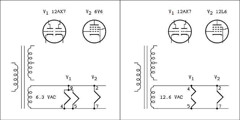 The third way is to show the heaters separate from the tubes as shown in Figure 8.2. In this method it is easier to show the heater connections in a duo triode such as the 12AX7. The circuit on the left shows parallel connection while the one on the right shows series connection.