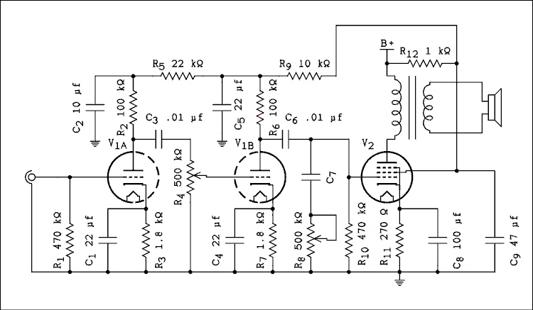 A musical instrument amplifier often does not employ negative feedback. NFB sharpens the overload corner so an amplifier without it will overload more gracefully than one that has it. Distortion which is anathema to audiophiles is often a desirable effect to a guitar player. But it needs to be a particular kind of distortion. Simple sharp clipping is usually undesirable.If NFB were to be applied to this amplifier one side of the voice coil winding would be grounded and the other side connected through a resistor to the cathode of V1A. C4 would be removed or a 100 ohm resistor would be connected in series with it. The tone control circuit consisting of R8 and C7 would have to be removed. If the tone control were left in place the NFB would reduce its effect to the point of being almost unnoticeable.