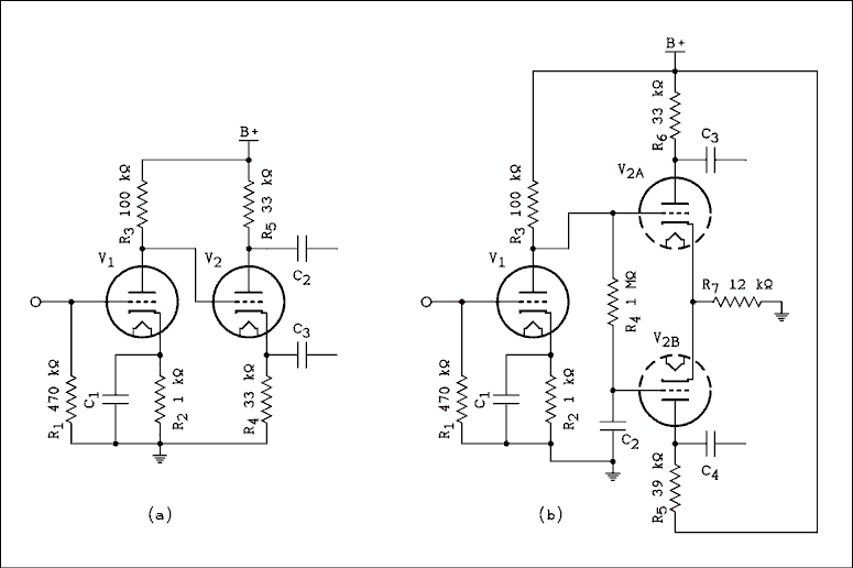 The circuit shown in Figure 8.4(b) is known as a long tail pair. V1 is usually a high μ triode while V2 is a medium or low μ duo triode. Signal is coupled directly from the plate of V1 to the grid of V2A. The signal is inverted and appears at the plate of V2A. Some of the signal is coupled from the cathode of V2A to the Cathode of V2B and then to the plate of V2B. In this signal path V2A acts as a cathode follower while V2B acts as a grounded grid amplifier. Both configurations do not invert the signal. The signal appears at the plate of V2B without being inverted. Thus the two signals at the two plates of V2 are 180 degrees out of phase. The signal path through V2A and V2B has slightly less gain than the signal path through V2A alone. The increased value of the plate load resistor on V2B, R5, compensates for the difference in gain. R4 makes certain that the voltages at the two grids of V2 are at the same DC potential. C2 grounds the grid of the grounded grid amplifier V2B. A very slight leak in C2 will imbalance the circuit and increase the distortion.