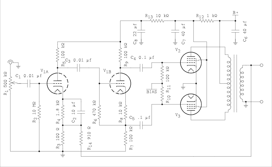 A single ended amplifier is about as simple as it gets. A typical example of a musical instrument amplifier is shown in Figure 8.3.
