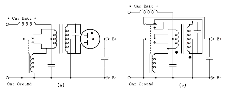 The circuit of Figure 8.7(b) is of a synchronous rectifier vibrator. Another set of contacts on the vibrator switches the secondary to the reservoir capacitor eliminating the need for any sort of electronic rectifier. The timing of the second set of contacts has been adjusted in the design so switching takes place when the current is zero. The advantage of this circuit is that there is one less component to fail and the disadvantage is that there are 3 more contacts in the vibrator to fail. The synchronous vibrator was also more costly to manufacture offsetting the cost of the rectifier tube.The most important difference between this circuit and the external rectifier circuit is that the "B+" will have the same polarity as the car battery. If this circuit were to be used in a positive ground car either the primary or secondary leads of the transformer would have to be reversed. But not both. As this would not be considered by the manufacturer as a field adjustment the radio would be made for either positive ground or negative ground and substitution would not be possible. It is conceivable that a service switch could be added to the design which would reverse the leads of the transformer primary. But there is another set of contacts to shake loose and cause trouble.