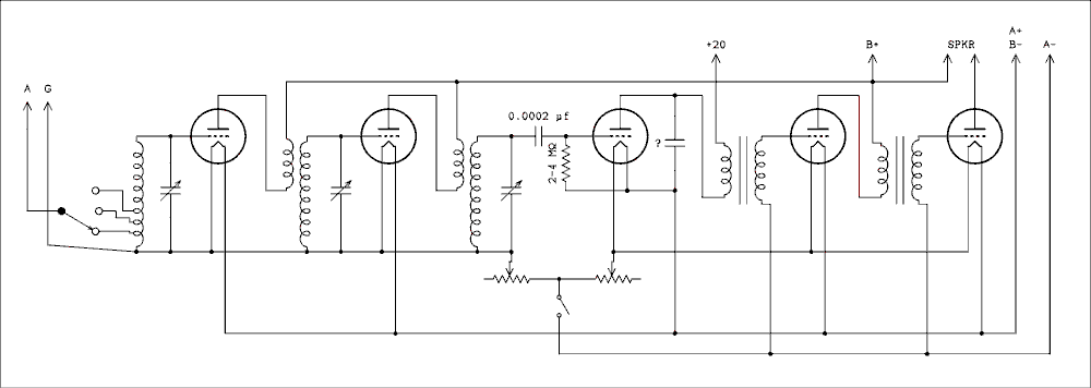 The oscillator needs a special note as this method of coupling to grid 1 of the converter tube is used in many AA5s as well. What appears to be a link winding which has one end not connected is just that although there is probably very little in the way of magnetic coupling going on. Capacitance from the tuned section of the oscillator coil to the link replaces the mica capacitor which is usually found here. This strikes me as going to great lengths to eliminate one capacitor but the economics must have worked or it wouldn't have been done this way.