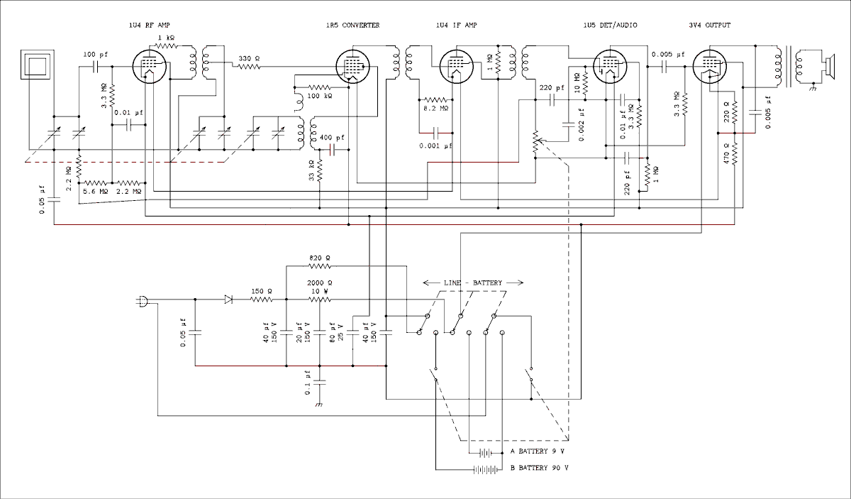 Upon examining this schematic the first thing that struck me was that full AGC is applied only to the Converter tube while about 28% of it is applied to the RF tube and none to the IF tube. After a few minutes of puzzlement I got it. The 1U4 is a sharp cutoff pentode. A remote cutoff pentode can provide gain control over a wide range even for voltages measured in volts or even 10s of volts. if this is attempted with a sharp cutoff tube serious distortion of an amplitude modulated signal will result. A sharp cutoff can be used as a gain control element if control voltage and signal level are kept small. The signal level is in the single digit millivolts or below. That is what is true for the RF stage of this radio.I remember that the AGC action was about the same as an AA5 but not as good as an AA6 wherein the AGC is applied to RF, converter, and IF stages. I assume that the tapped secondary of the RF plate coil and the resistor in series with grid 3 of the 1R5 is to improve performance under extremely strong signal conditions. I don't remember it ever being blocked even when riding in a car with it and driving past a radio station's tower.