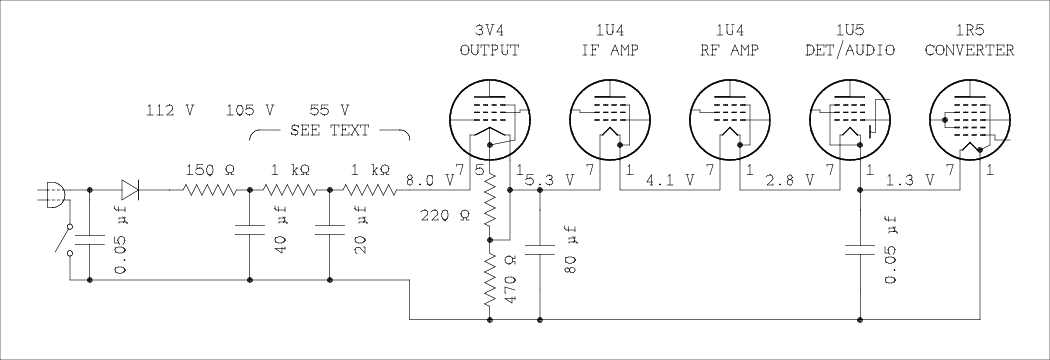 Note that local audio ground is established from the negative side, pin 1, of the filament of the 1U5. You may find the filament string a bit tough to tease out so here is a simplified diagram of the chain.