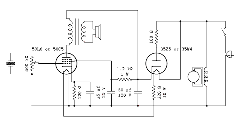 There were other variations than those indicated in the schematic. The first electric phonograph I owned used a 117L7/M7 which incorporated the rectifier and the power amplifier into the same envelope with a 117 volt heater. Another variation I saw used a selenium rectifier and a 25L6 amplifier. The motor had been designed to operate from 92 volts at a current of 300 mA. The motor was in series with the heater.If you find one of these phonographs your chances of ever getting it to operate in its original state are absolutely zero. The reason is the crystal pickup. Rochelle salt is a very hydroscopic material. That means it loves water and will grab onto any stray water molecules that come by. My original phonograph was bought and used for about 2 years in Iowa. Then we moved to Florida. In that humid climate it only lasted about 6 months. After having the cartridge replaced for a cost of 8 dollars it went out after another 6 months. 8 dollars was a considerable sum of money in 1952 and my mother said I would just have to do without rather than spend another 8 bucks on another crystal. The symptom is the sound grows progressively weaker and weaker until the volume control is up all the way and from that point it fades out to inaudibility. No doubt one of these cartridges would last for several years in Arizona but humid climates are death to them.