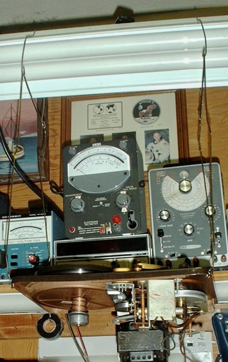This picture shows the transport mechanism from a Silvertone wire recorder hung by coat hanger wire from my workbench light. The florescent fixture is hung from the ceiling by chains attached to screw hooks that go into ceiling joist. Any record changer can be hung in the same way. The wires pass through hooks in wires that go over the top of the fixture. This is so the wires can be folded up against the fixture out of the way when not in use.Once the bearings are properly lubricated and running freely the changer will work most of the time. If it doesn't there may be a missing spring, misadjusted or misaligned part, or a worn part.