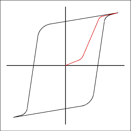 If in each case we start with a piece of fully demagnetized material and take the magnetizing force up from zero to a specific value and then back to zero the remaining magnetism can be plotted on a graph. What results is the graph below.