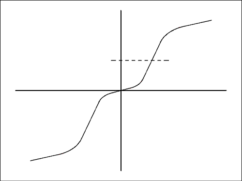 This is the transfer function of our intuitive tape recorder described at the beginning of this section. Some method of linearizing the function is needed. The very first thing tried when magnetic recording was being invented was the use of DC bias.If a direct current was superimposed on the audio signal to be recorded and the value of the DC places the magnetizing force at the center of the linear region as indicated by the dashed line recording can take place with a tolerable amount of distortion. I once owned a recorder that used a permanent magnet to erase the tape and DC bias for recording. It wasn't suitable for music but I used it for several years to exchange voice letters with members of my family.