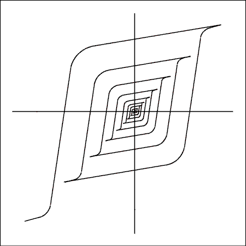 If the material starts out with zero magnetism and magnetizing force is applied the amount of magnetism will follow the red line up to the hysteresis loop and then it will be stuck on the loop. The only way to get back to zero will be to apply a slowly decreasing AC magnetizing force which will loop back to zero as shown in figure 9.19.If magnetizing force is altered from zero and then brought back to zero the remaining magnetism will depend on whether the magnetizing force was positive or negative. If the force goes up the red line to the tip of the curve in the first quadrant and then is reduced to zero the remaining magnetism will follow the right hand side of the curve back down to zero force but there will be some magnetism left. This is desirable but the problem is the nonlinearity of the curve.