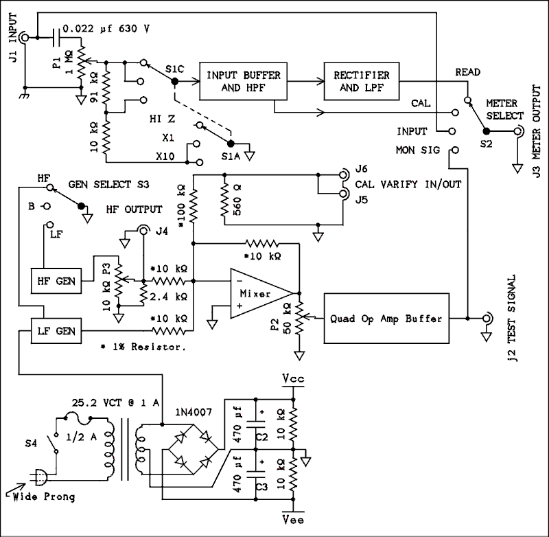The unattenuated output of the last op amp has been brought out in case it is ever needed for testing and troubleshooting. The calibrated output is fed through a screwdriver adjustable potentiometer to the "READ" position of S2.