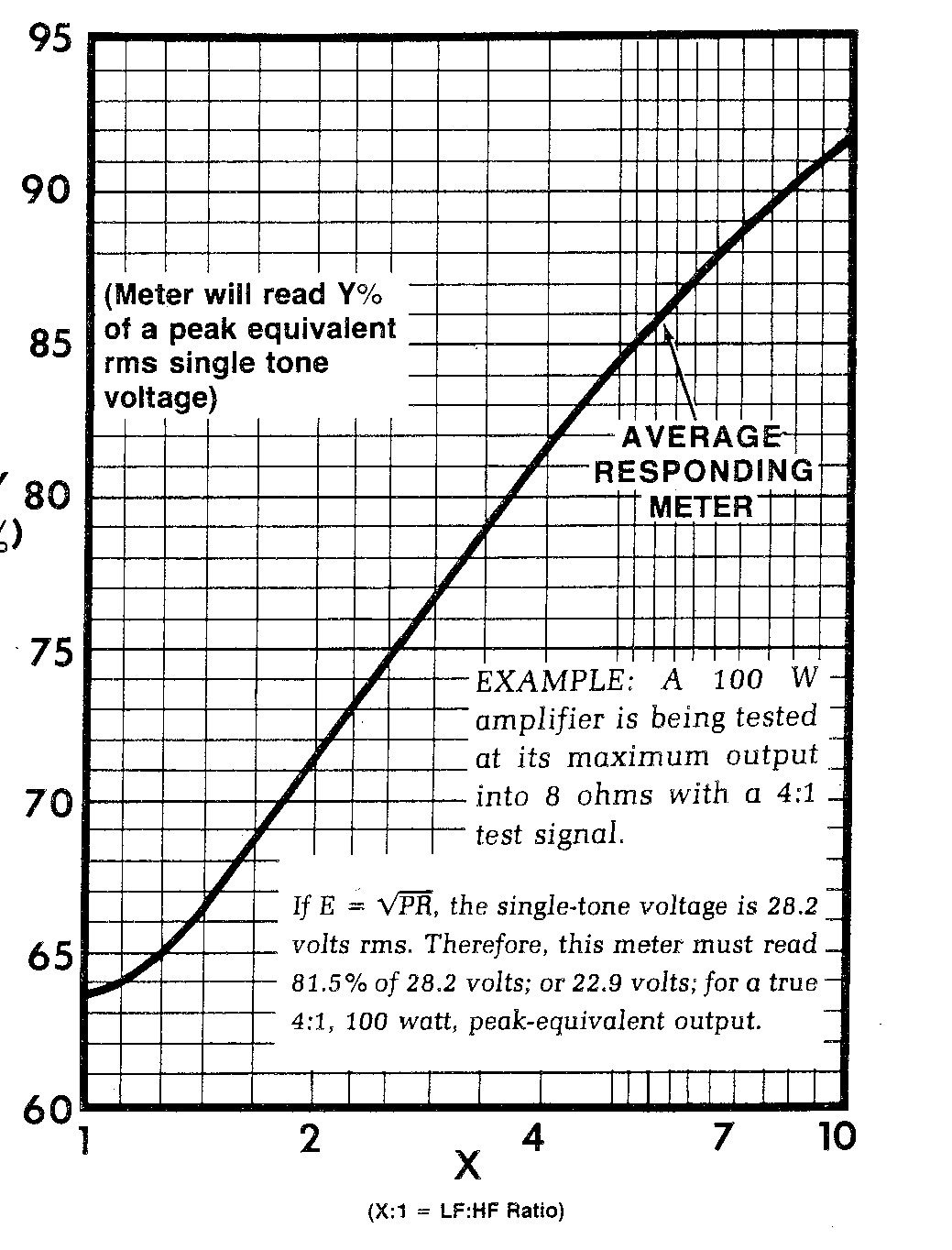 Because the IM test signal is a combination of two sine waves of two different frequencies the effective power and peak voltage are greater than a standard AC voltmeter would indicate for a single sine wave. Thus if you want to measure the distortion in an amplifier at a power of, for example, 25 watts you must use a voltage lower than the normal calculation of V = sqrt(Po RL). This would be sqrt(25 *8) which is 14.14 volts. When a test signal with a ratio of 4 to 1 is used the derating factor is 0.815. So you would set the amplifier's output to 14.14 * 0.815 = 11.52 volts. The graph below will allow you to determine the derating factor for a wide range of LF to HF ratios.